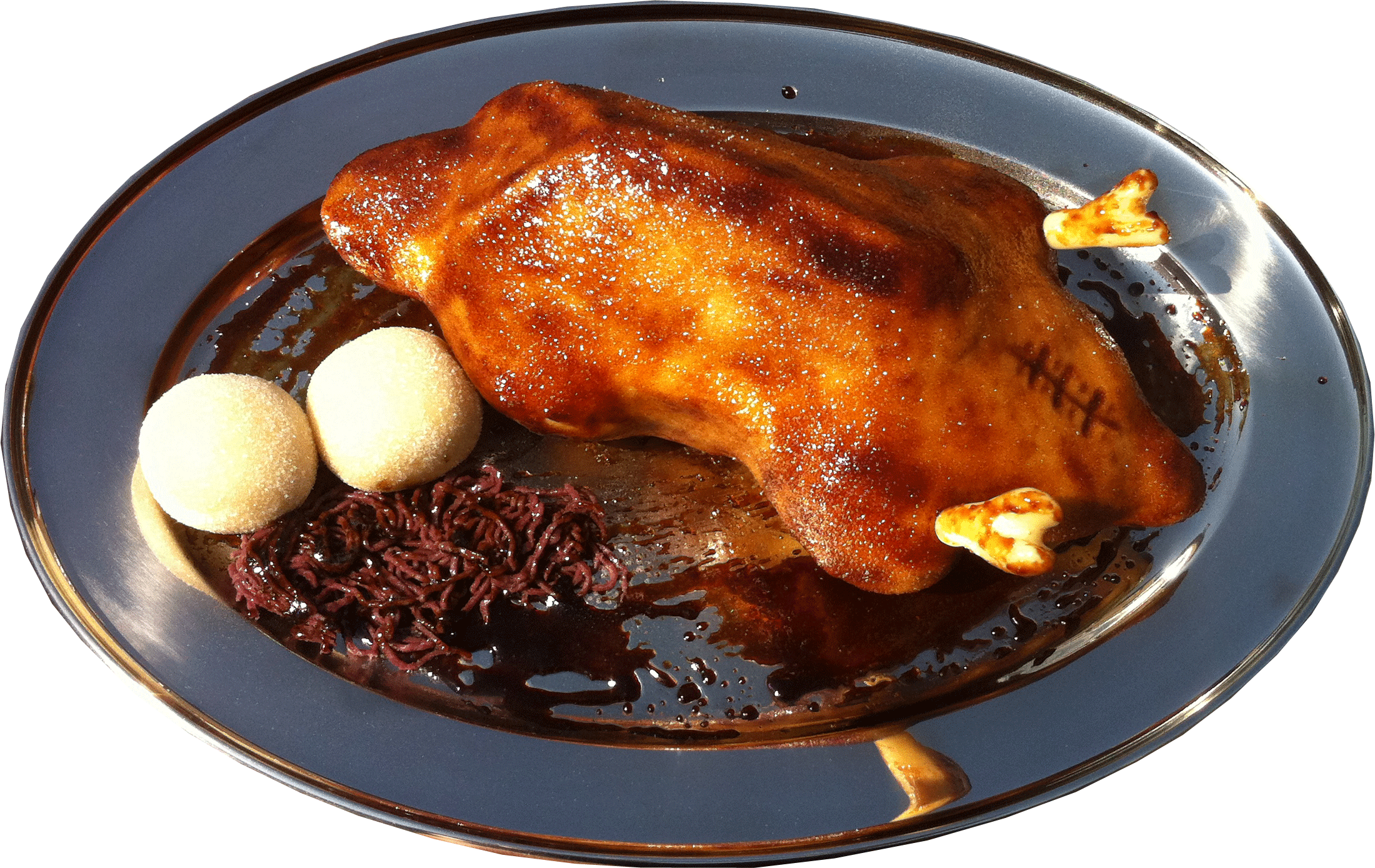 Klöße und Rotkohl sind aus Marzipan. Die Gans ist aus einer saftigen Sandmasse auf Wunsch mit Nougat gefüllt.